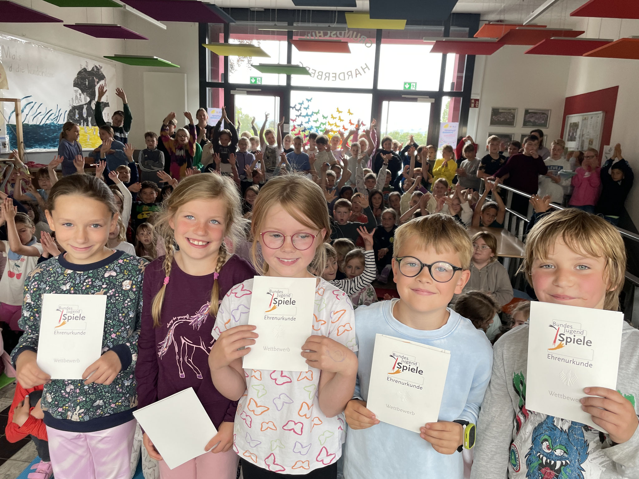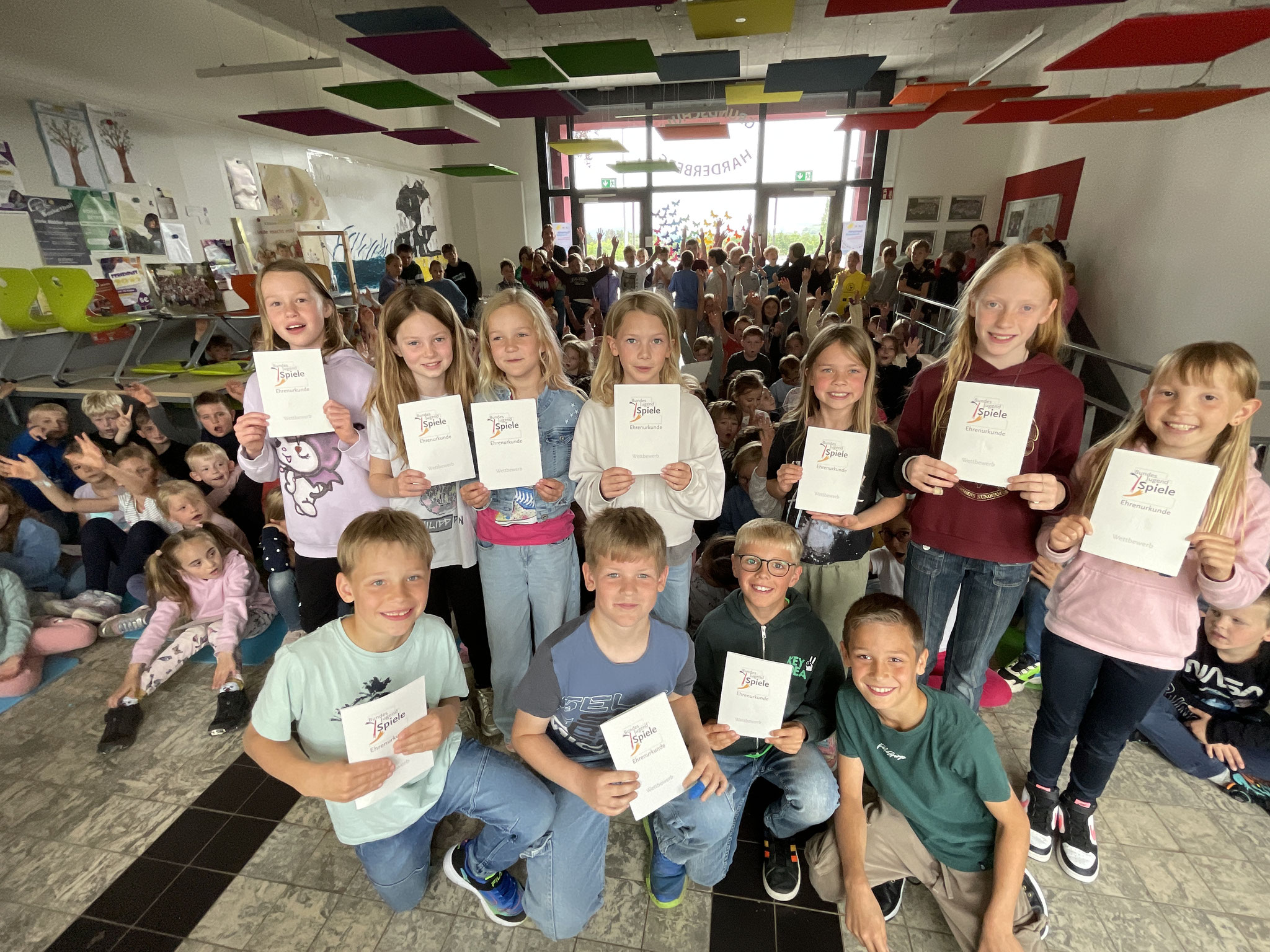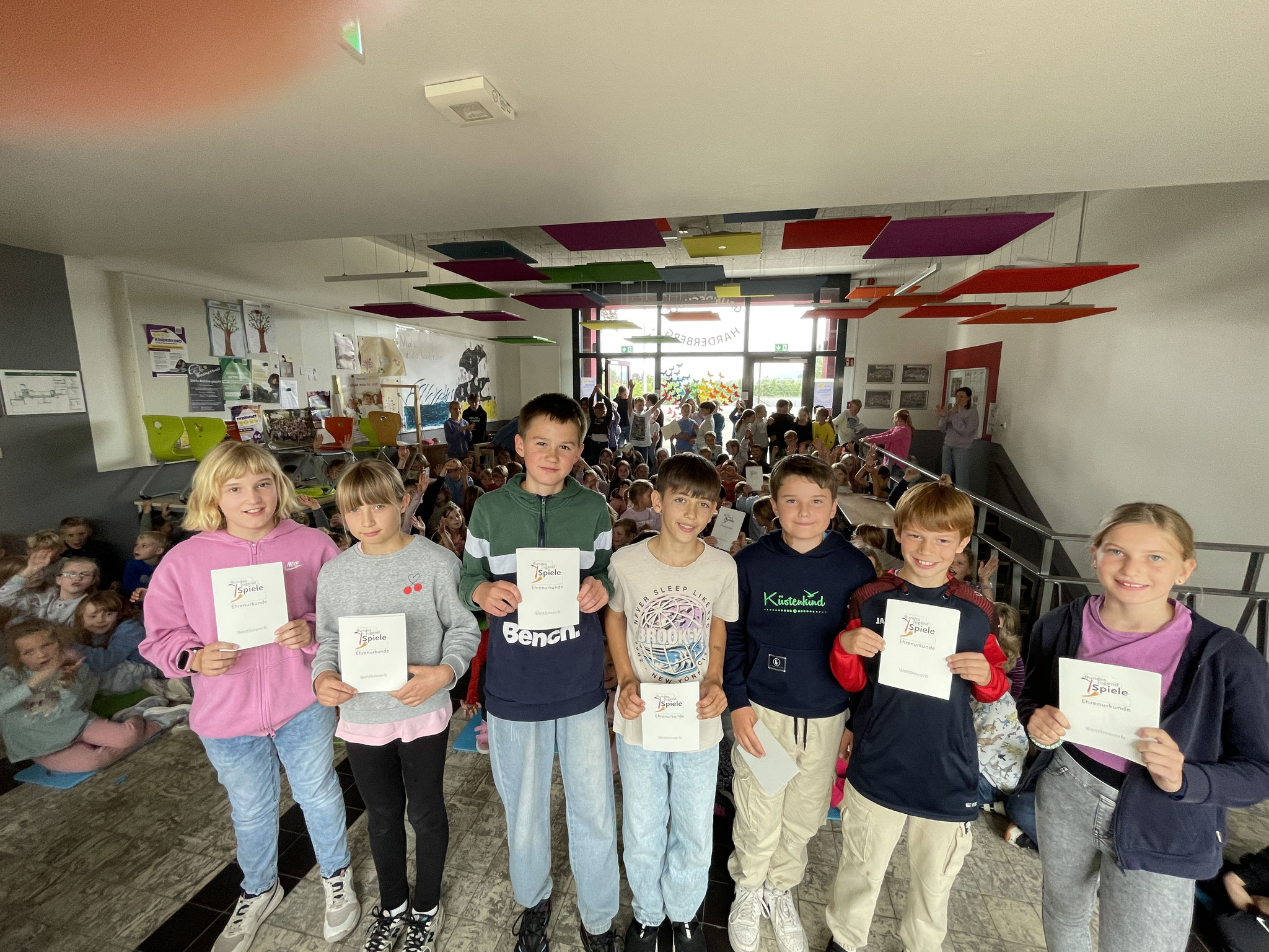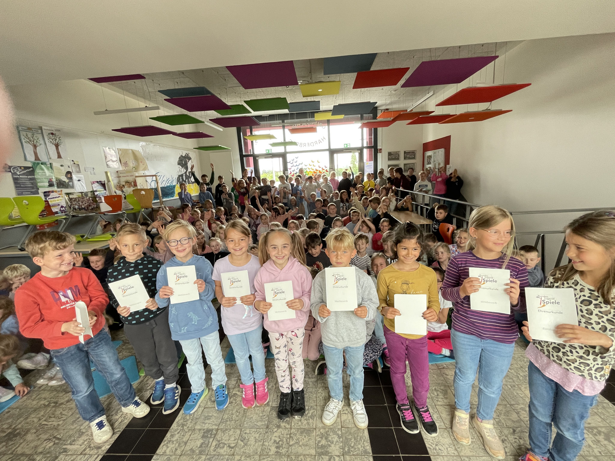 Im Rahmen der Schulversammlung am "Rope Skipping"-Tag wurden auch die Schwimmer*innen geehrt. Beim Aktionstag "Fit for fun" im Panoramabad haben die Kids der Grundschule am Harderberg den zweiten Platz belegt. Herzlichen Glückwunsch!