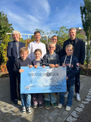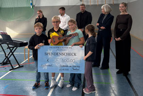 Im Rahmen einer Schulversammlung, die sehr musikalisch geprägt war, wurde feierlich der Scheck an die Schülersprecher*innen überreicht und den Sponsoren gedankt. Neben Frau Penner und Herrn Schilling von Prinzen & Berning sowie Frau Schmutte und Frau Neumann von Appelhans Immobilen war auch Herr Temmen von der Firma MBN eingeladen. MBN hat bereits in den Sommerferien die Grundschule am Harderberg finanziell bei der Umgestaltung des Grünen Klassenzimmers unterstützt.