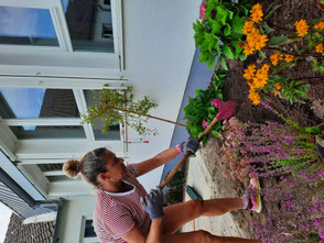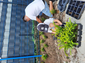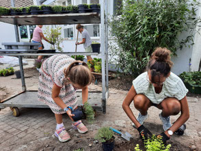 Die drei gepflasterten Bereiche im "Grünen Klassenzimmer" sind fertig. Nun fehlen "nur noch" die Pflanzen... in den Ferien war es dann soweit. Einige freiwillige fleißige Helfer*innen trafen sich nachmittags am Fr, 08.08. ausgestattet mit Spaten und weiterem Gartengerät, um dem Giersch Herr zu werden.